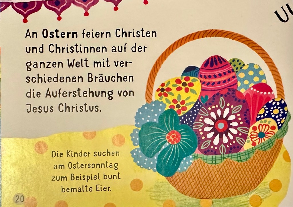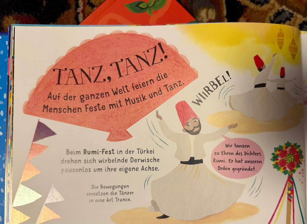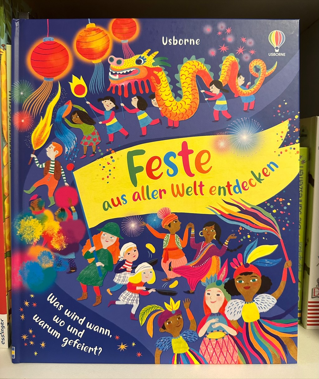 Das Buch „Feste aus aller Welt entdecken“ von Usborne ist eine faszinierende und bereichernde Entdeckungsreise durch die vielfältigen kulturellen Traditionen und Feierlichkeiten weltweit. Das Buch hat unsere Neugier beim durchlesen erweckt, so haben wir dann auch herausgefunden das hier in der Schweiz auch Chinesisches Neujahr gefeiert wird. Sogar mit Drachen die durch die Innenstadt ziehen. Schön finde ich, dass Kinder sowie die Erwachsenen neue Bräuch und Traditionen kennenlernen können.