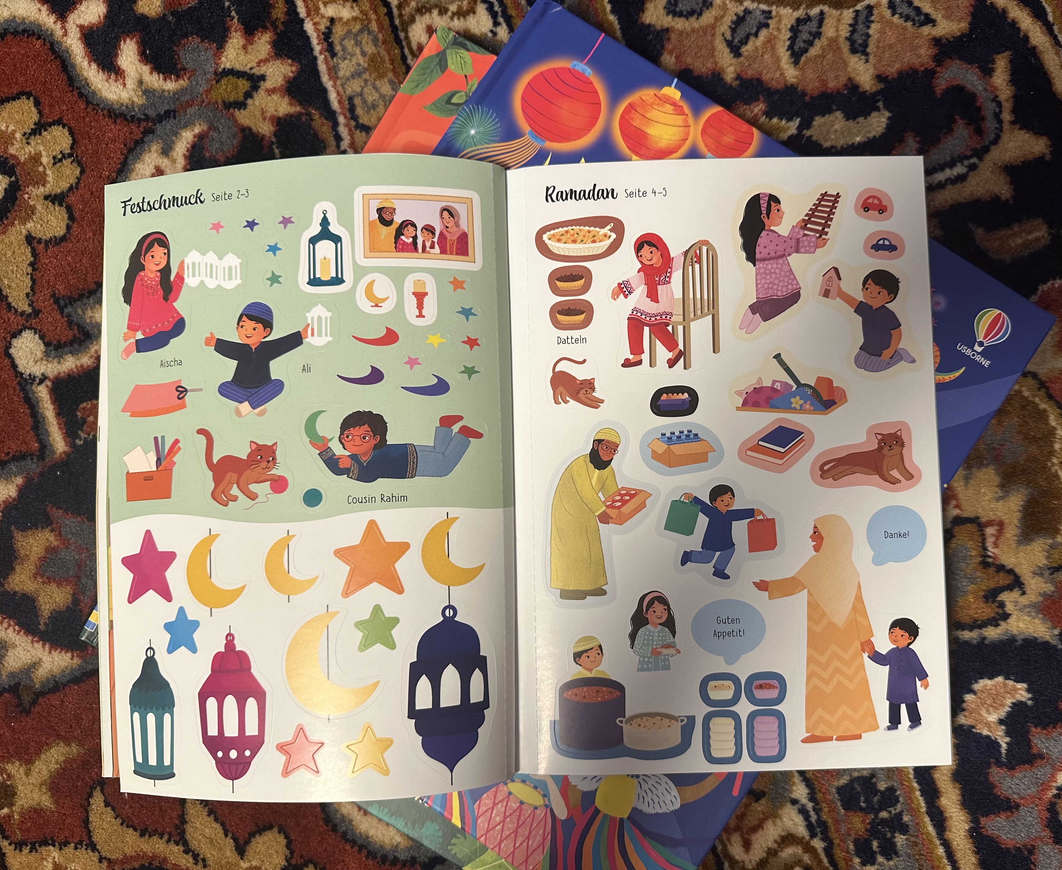 Ali und Aischa sind aufgeregt! Es ist Ramadan und bald wird die ganze Familie zusammenkommen, um das Zuckerfest zu feiern. Begleite sie bei den Vorbereitungen für dieses wichtige islamische Fest und gestalte mit über 200 wiederablösbaren Stickern die bunten Szenen.